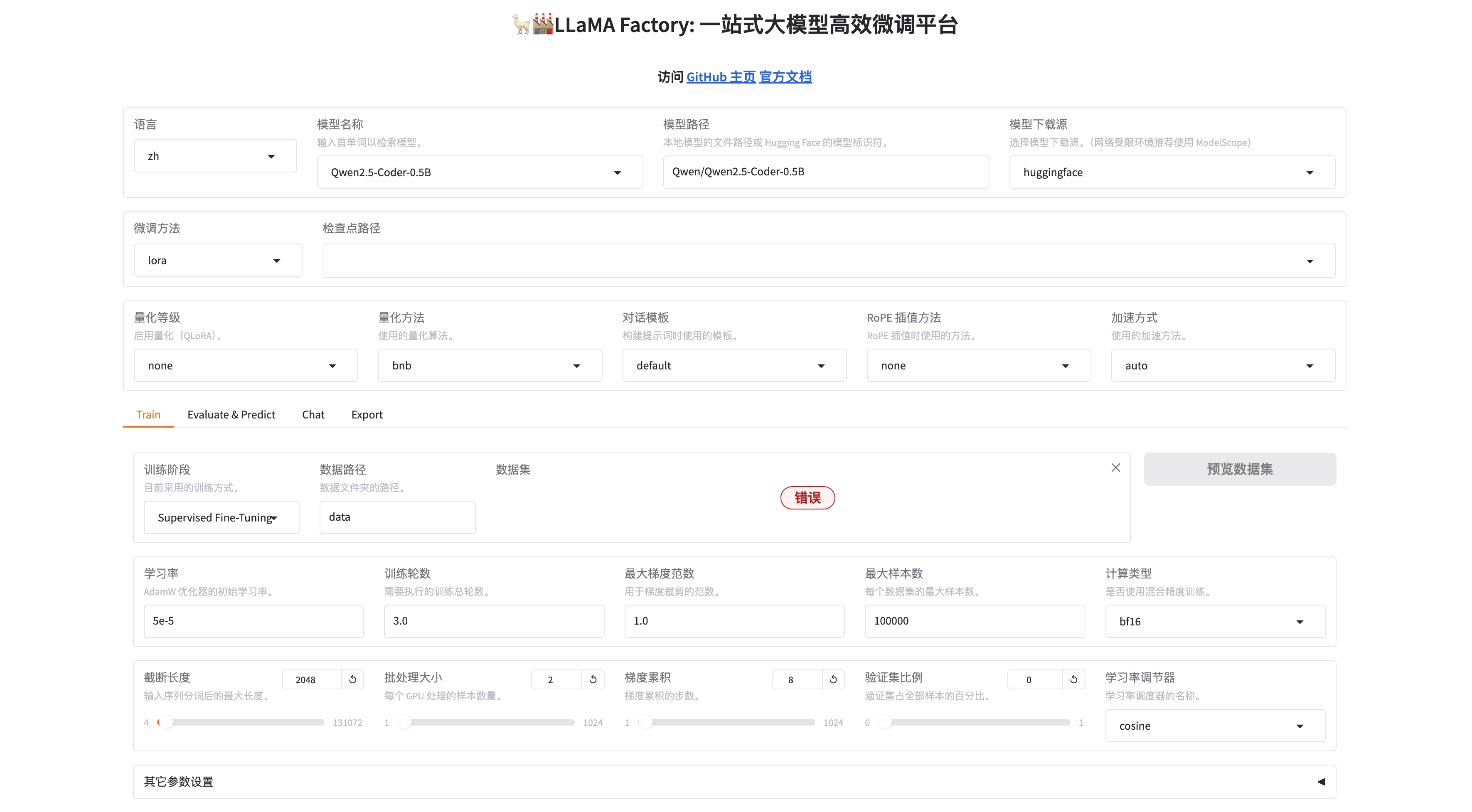 微调使用的数据集:数据集的格式、路径、验证集的比例等等;