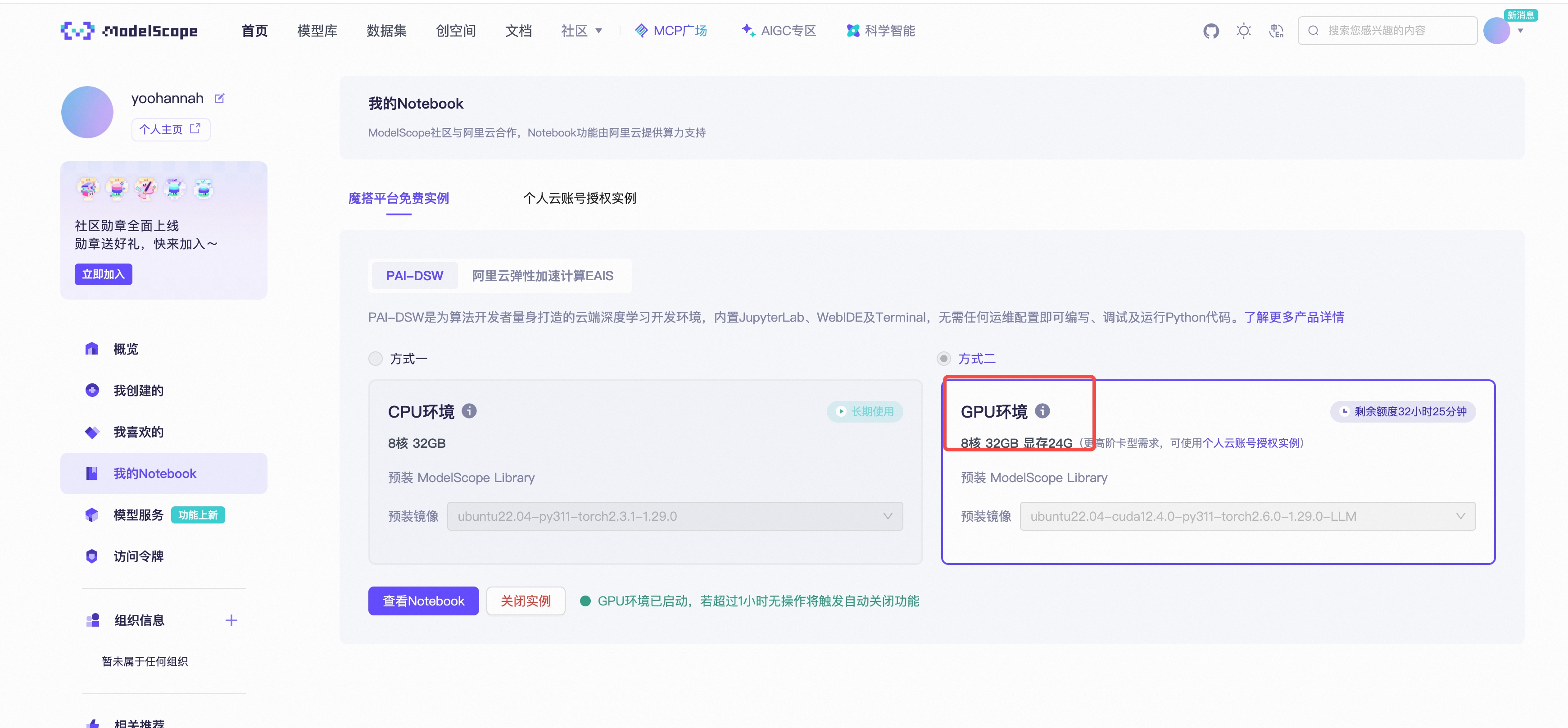 阿里云 - MODEScope - My Notebook 支持使用GPU